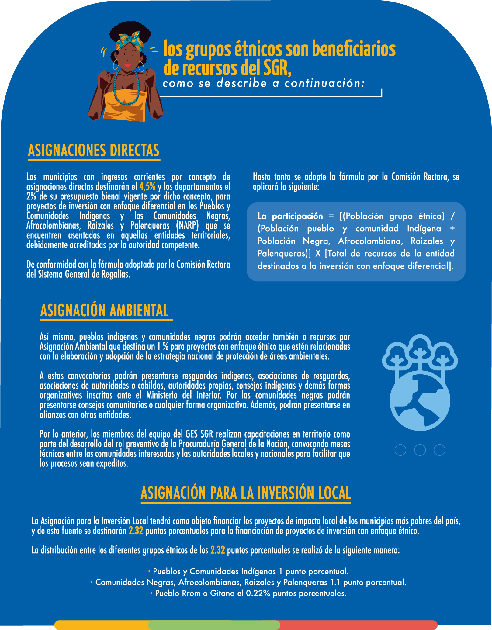 La Ley 2056 de 2020 establece que se debe propiciar la adopción de mecanismos de inversión de los ingresos minero-energéticos que prioricen su distribución hacia la población más pobre por encima de otros criterios y contribuya a la equidad social y la promoción de la diversidad étnica cultural, y que se debe implementar mecanismos que hagan efectiva la inclusión, igualdad, equidad, participación y desarrollo integral de: